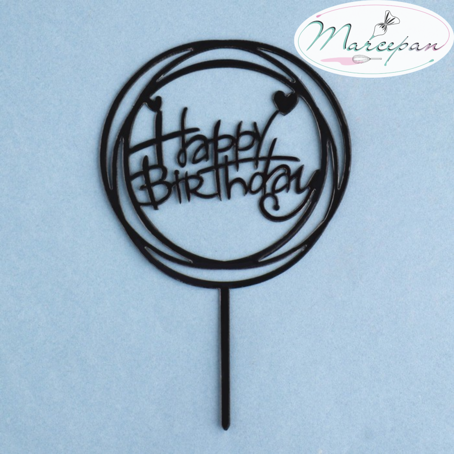 —Топпер "Happy Birthday" круг с сердечками черный глянец